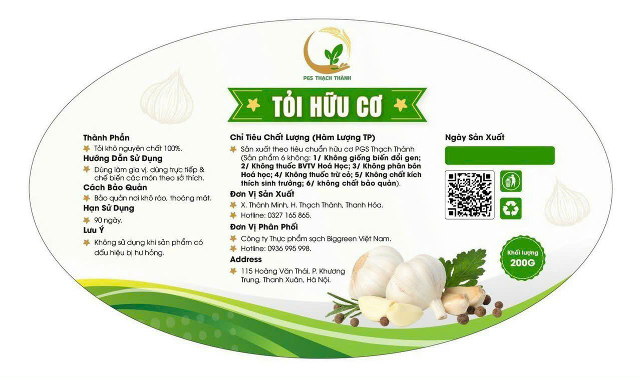 Tỏi Hữu Cơ PGS, 5 không: 1/ Không sử dụng giống tỏi biến đổi gen 2/ Không sử dụng phân bón hoá học trong canh tác tỏi 3/ Không sử dụng thuốc bảo vệ thực vật hoá học trong quá trình canh tác tỏi 4/ Không sử dụng thuốc trừ cỏ và chất kích thích sinh trưởng trong quá trình canh tác 5/ Không sử dụng thuốc hay các chất bảo quản trong quá trình bảo quản tỏi Sản phẩm được quản lý nghiêm ngặt bởi dự án của Tổ chức Bánh mỳ Thế Giới; Trung tâm Hỗ trợ phát triển Phụ nữ và Trẻ em; UBND huyện Thạch Thành - Thanh Hoá. Sản phẩm đang được bán và giới thiệu tại hệ thống cửa hàng thực phẩm sạch Biggreen. Hotline đặt hàng: 0829.295.998 Hotline CSKH: 0936.233.998